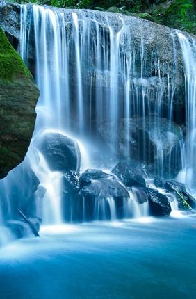 The waterfall cascades down the face, and creates an ethereal and dynamic relationship with the heritage bluestone wall below the tower