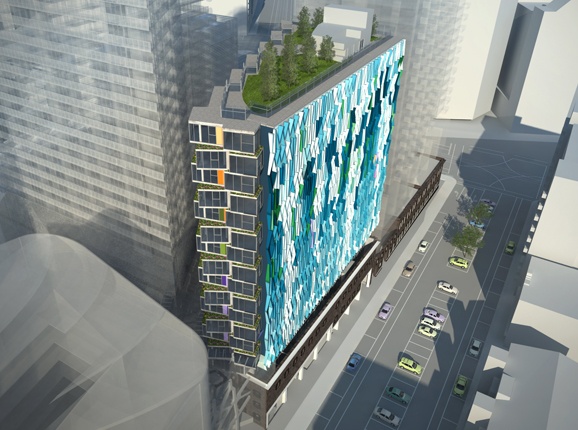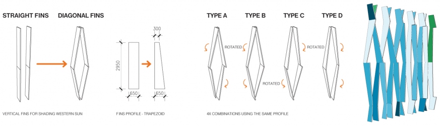 Each apartment that faces west sits behind a cascading waterfall inspired facade, made up of coloured aluminum fins, which offer shade and a refuge from the hot afternoon sun.