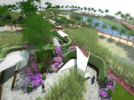 Similar to a river which distributes its pebbles according to the ebb and flow of its negotiation with the landscape, studio505 have placed clusters of larger pebbles to signify the areas where people congregate, whilst strategic placement of single pebbles or sinuous ribbons of pebbles direct the flow of people to these areas.