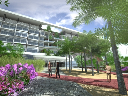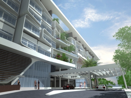 studio505, together with Surbana Corporation and Arkitek TM are working on the architectural design and interior design for a new 300 bed private medical centre in Sabah, Malaysia. The building, whilst compact in its exterior form and appearance, is in plan based on an H-type layout with two vertical, central patient and visitor cores. This configuration, typically housing 4no wards per floor, allows for as many functions as possible to be orientated to the building exterior thus maximising the use of daylight. The entire building is climate controlled to counter the hot humid local environment, except for the two storey high entrance lobbies which are designed as a natural breezeway.