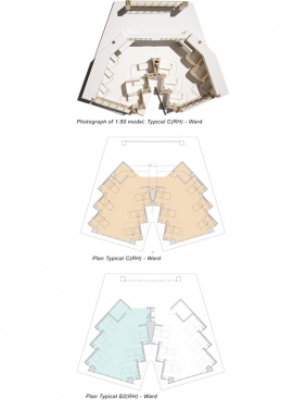 During the concept design stage studio505 explored and developed several different ward configuration options in addition to building multiple physical models of various sizes, including a 1:1 prototype to test out views and patient field of vision. studio505 used state-of-the-art computer software to analyse insolation, sun shading, ventilation airflow and compared the wind flow simulation of both typical rectangular shape wards and studio505’s innovative angled ward module to compare.